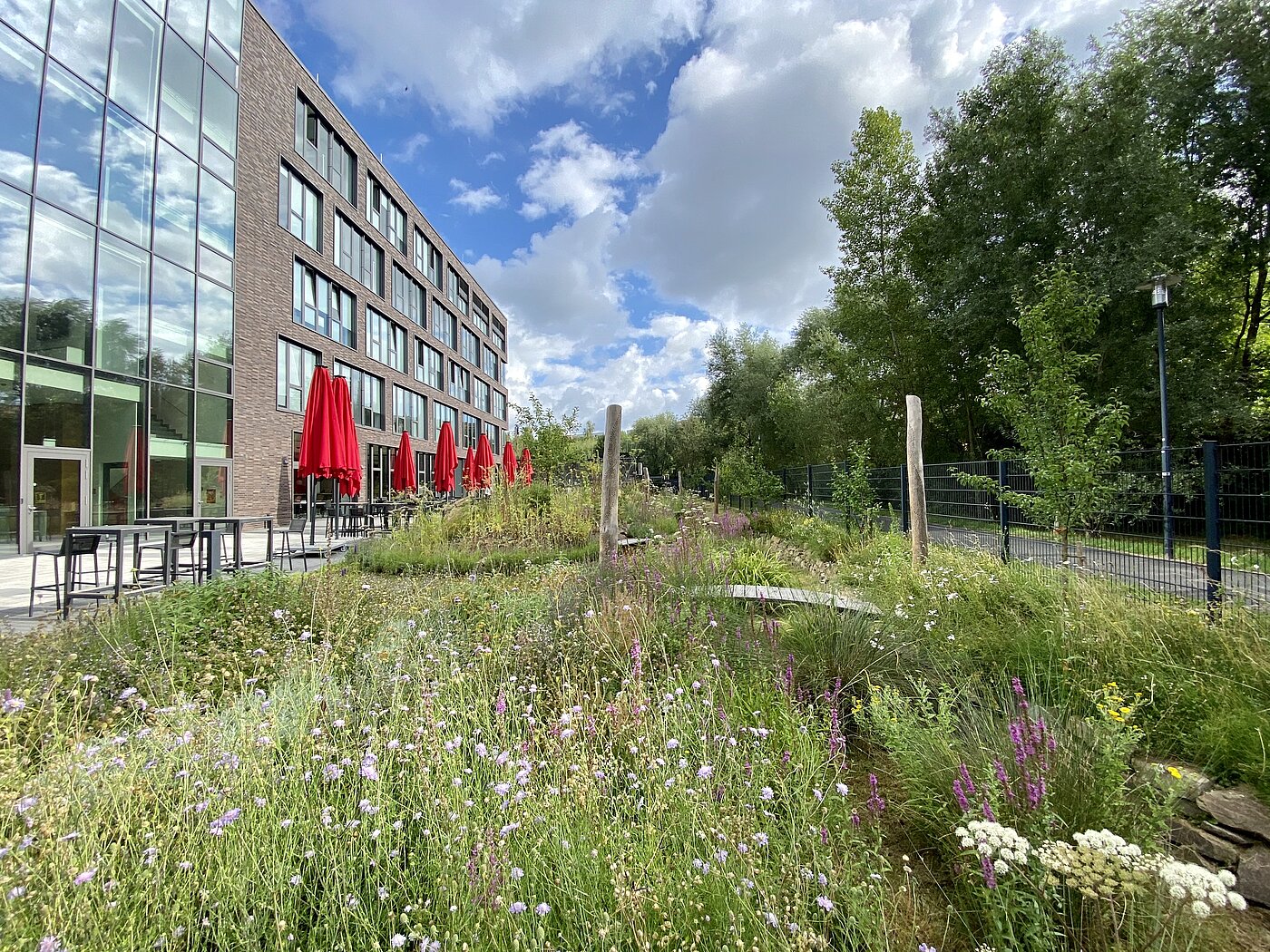 Großflächige Gebäude, asphaltierte Parkplätze und breite Straßen prägen Industrie- und Gewerbegebiete. Diese baulichen Strukturen bringen Vorteile für Logistik und Produktion, sind aber auch mit besonderen Herausforderungen verbunden, wenn es um die Folgen des Klimawandels geht. Im interkommunalen Gewerbegebiet Mönchhof der Kommunen Raunheim und Kelsterbach erläuterte das Hessische Landesamt für Naturschutz, Umwelt und Geologie (HLNUG) heute, wie sich solche Standorte anpassen können.