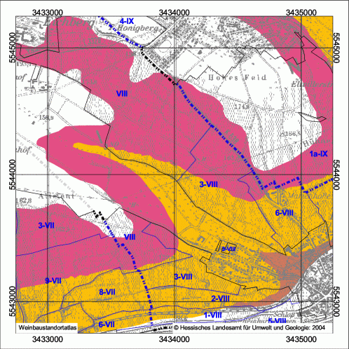 Collective vineyard: Heiligenstock, Vineyard: Klosterberg, Size: 12,45 ha Collective vineyard: Heiligenstock, Vineyard: Sandgrub, Size: 112 ha Collective vineyard: Honigberg, Vineyard: einzellagenfrei, Size: 14,17 ha Collective vineyard: Honigberg, Vineyard: einzellagenfrei, Size: 88,13 ha Collective vineyard: Honigberg, Vineyard: Marcobrunn, Size: 9,6 ha Collective vineyard: Honigberg, Vineyard: Siegelsberg, Size: 16,58 ha Collective vineyard: Honigberg, Vineyard: Michelmark, Size: 0,56 ha Collective vineyard: Honigberg, Vineyard: Michelmark, Size: 17,73 ha Collective vineyard: Honigberg, Vineyard: Michelmark, Size: 34,64 ha Collective vineyard: Honigberg, Vineyard: Schloßberg, Size: 7,89 ha Collective vineyard: Honigberg, Vineyard: Hohenrain, Size: 19,84 ha Collective vineyard: Honigberg, Vineyard: Steinmorgen, Size: 2,96 ha Collective vineyard: Deutelsberg, Vineyard: Heiligenberg, Size: 24,54 ha Collective vineyard: Deutelsberg, Vineyard: Rheingarten, Size: 1,72 ha Collective vineyard: Deutelsberg, Vineyard: Mannberg, Size: 8,92 ha Collective vineyard: Deutelsberg, Vineyard: Nußbrunnen, Size: 12,22 ha Collective vineyard: Deutelsberg, Vineyard: Wisselbrunnen, Size: 17,72 ha Collective vineyard: Deutelsberg, Vineyard: Hassel, Size: 35,68 ha