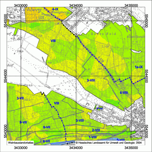 Collective vineyard: Heiligenstock, Vineyard: Klosterberg, Size: 12,45 ha Collective vineyard: Heiligenstock, Vineyard: Sandgrub, Size: 112 ha Collective vineyard: Honigberg, Vineyard: einzellagenfrei, Size: 14,17 ha Collective vineyard: Honigberg, Vineyard: einzellagenfrei, Size: 88,13 ha Collective vineyard: Honigberg, Vineyard: Marcobrunn, Size: 9,6 ha Collective vineyard: Honigberg, Vineyard: Siegelsberg, Size: 16,58 ha Collective vineyard: Honigberg, Vineyard: Michelmark, Size: 0,56 ha Collective vineyard: Honigberg, Vineyard: Michelmark, Size: 17,73 ha Collective vineyard: Honigberg, Vineyard: Michelmark, Size: 34,64 ha Collective vineyard: Honigberg, Vineyard: Schloßberg, Size: 7,89 ha Collective vineyard: Honigberg, Vineyard: Hohenrain, Size: 19,84 ha Collective vineyard: Honigberg, Vineyard: Steinmorgen, Size: 2,96 ha Collective vineyard: Deutelsberg, Vineyard: Heiligenberg, Size: 24,54 ha Collective vineyard: Deutelsberg, Vineyard: Rheingarten, Size: 1,72 ha Collective vineyard: Deutelsberg, Vineyard: Mannberg, Size: 8,92 ha Collective vineyard: Deutelsberg, Vineyard: Nußbrunnen, Size: 12,22 ha Collective vineyard: Deutelsberg, Vineyard: Wisselbrunnen, Size: 17,72 ha Collective vineyard: Deutelsberg, Vineyard: Hassel, Size: 35,68 ha